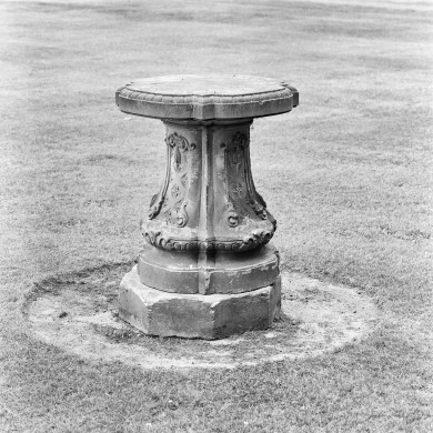 Nabij de moestuin staat een 18de-eeuwse Bentheimer zandstenen gedecoreerde SOKKEL met een geschulpte wijzerplaat, de loden ZONNEWIJZER zelf is wegens beschadiging binnen opgeslagen.