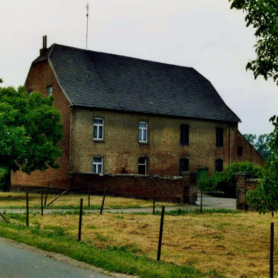 BOERDERIJ MET SCHUUR. Aan de overzijde van de weg Meerssenhoven staan in het verlengde van de bouwhuizen twee 18de-eeuwse bakstenen gebouwen (boerderij en schuur), die aan de wegzijde middels een gemetselde muur met een mergelstenen afdekking en waarin een centrale doorgang tussen pijlers, met elkaar verbonden zijn. Beide gebouwen zijn gelijkvormig in bouwmassa, nokhoogte en vormgeving. Aan de westzijde staat een op rechthoekige grondslag opgetrokken bakstenen BOERDERIJ bestaande uit twee bouwlagen en een kapverdieping onder een met (vernieuwde) pannen gedekt, licht geknikt wolfdak. In de kopse gevel ter hoogte van de kapverdieping twee getoogde vensters en een dicht gemetseld oeil-de-boeuf in de top. Regelmatige indeling van de voorgevel met vier vensterassen voorzien van T-vensters en een toegangsdeur. Tegen de achtergevel een aangebouwde stalling onder lessenaarsdak. Aan de oostzijde staat een op rechthoekige grondslag opgetrokken bakstenen SCHUUR met hoog opgetrokken metselwerk overkapt door een met gesmoorde en rode Oud-Hollandse pannen gedekt, geknikt wolfdak. In de top van de kopse gevel drie oeil-de-boeufs. De voorgevel heeft centraal een dubbele inrijdeur onder een latei, oorspronkelijk rondboog (zie bouwsporen) en aan weerszijden daarvan een staldeur. Tegen de achtergevel een aangebouwde stalling onder lessenaarsdak.