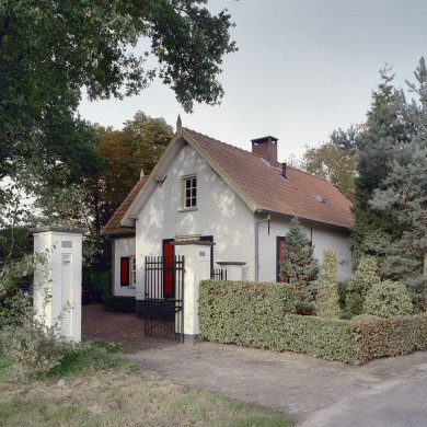 PORTIERSWONING, XXa; witgeverfd bakstenen woonhuis op T-plattegrond; één bouwlaag onder met rode pannen gedekte zadeldaken; schuifvensters met kleine roedenverdeling en luiken.