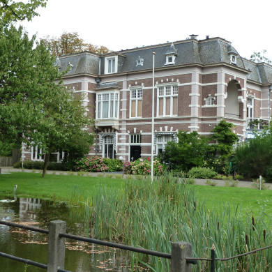 Van de omheining resteert alleen de INRIJPOORT. Deze bestaat uit drie gietijzeren gecanneleerde posten met bolvormige bekroningen met daartussen smeedijzeren draaihekken, voorzien van bewerkte punten. INTERIEUR: De verschillende bestemmingen, die het pand heeft gehad, hebben vele interne wijzigingen opgeleverd, zodat van een samenhangend geheel geen sprake meer is. Het best bewaard bleef de salon aan de voorzijde. Hier is een balkenplafond met vernieuwde moerbalken op sleutelstukken en een gepaneelde eikenhouten lambrisering. De haardpartij bevindt zich in een nis, die eveneens voorzien is van een gepaneelde lambrisering. De schoorsteenmantel heeft marmeren penanten. Het houten tablet wordt gedragen door marmeren voluten. De overgang van de boezem naar de nis wordt begeleid door gestucte spitsbogen. Verder bleven onder andere bewaard de trap met bewerkte paal en balusterleuningen, enkele paneeldeuren in geprofileerde omlijstingen met supraportes, een roodgranieten spiltrap in de traptoren aan de achterzijde en een stucplafond in de gang op de derde bouwlaag.