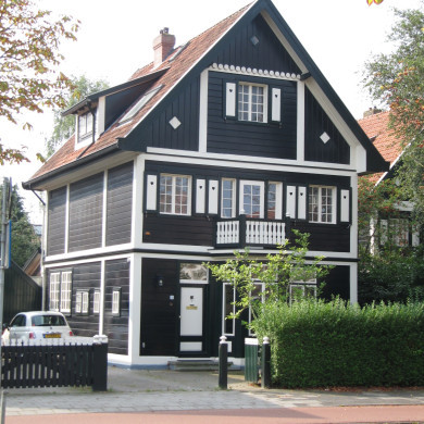 EXTERIEUR: De villa is gebouwd in houtskelet met houten wanden. De vooral liggende houten delen, met veer en groef in elkaar gestoken, zijn in stijl- en regelwerk opgenomen. Met het flink overstekende zadeldak heeft de villa een duidelijk uitheemse Chalet-stijl.