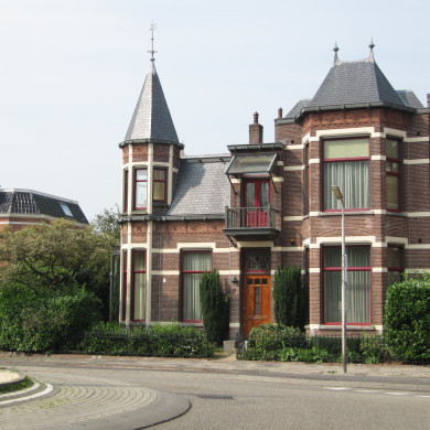 EXTERIEUR: Hoekpand op een levendige plattegrond en met een gevarieerde volumewerking door risalerende en terugliggende gedeelten. Grotendeels twee bouwlagen met een plat dak hoog, maar met gedeelten voorzien van dakschilden die een enkele bouwlaag hoog lijken; twee andere elementen rijzen met hun daken hoger op: het erker-element en de toren. Aan de noordoostzijde de trapeziumvormige erkerpartij over twee lagen met schildkap met zinken hoekpironnen. Nagenoeg in het midden van de oostzijde de entreepartij met hardstenen stoep, oorspronkelijke, gesneden deur met lichten en bovenlicht met glas-in-lood in Art Nouveau-vormen, daarboven balkon op schoren en overhuifde openslaande deuren en plat dak. De zuidoostelijke hoekpartij lijkt lager door de afgeknotte dakschilden en de torenpartij die hier op de hoek uit oprijst en bekroond wordt door een achtzijdige spits met zinken pinakel en windvaan. Nabij de hoek aan de zuidzijde is een serre van stijl- en regelwerk uitgebouwd. Midden in de zijgevel springt een partij met een afgewolfde geveltop met zinken pinakel enigszins uit. De zuidwestelijke partij is een bouwlaag hoog en voorzien van een groot balkon met een natuurstenen balustrade. Het pand is opgetrokken op een hardstenen plint van grauwbruine baksteen, versierd met dorpelbanden van kunststeen, de hoektoren ook met vertikale hoekpenanten van kunststeen. De muren worden beëindigd door friezen van gemetselde siervakken onder geprofileerde bakgoten op gesneden consoles. Alle daken en dakschilden gedekt met leien in maasdekking. Alle muuropeningen met gevarieerd gevormde vensters en vensterpartijen zijn rechtgesloten; meestal gedekt door kunststenen lateien, soms met segmentvormige ontlastingen en boogtrommels van siermetselwerk.
