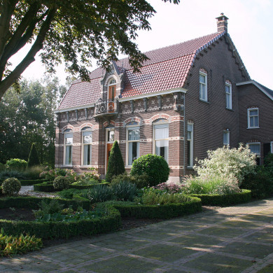 Voor het huis bevindt zich een in aanleg gewijzigde tuin. Deze is aan de ingang voorzien van een sterk verweerd smeedijzeren hekwerk met ijzeren sierbloemen. Iets terugliggend ten opzichte van de voorgevel is het woonhuis verbonden met een sober vormgegeven, haaks geplaatst keuken/stalgedeelte met onder meer hooi- en voederluiken. Fries met muizentand. Het is een éénlaags aanbouw met in kruisverband gemetselde gevels van machinale baksteen onder een met kruispannen gedekt zadeldak. Dit gedeelte fungeert tegenwoordig als aparte ingang, keuken en opslagruimte. In het dak zijn enkele vensters met klapramen aangebracht. Aan de achterzijde is dit gedeelte voorzien van een buiten de bescherming vallende overkapping. De houten klampdeur en de vensters aan de voorzijde zijn elk overtoogd met een segmentboog met metseldecoratie in de trommel.
