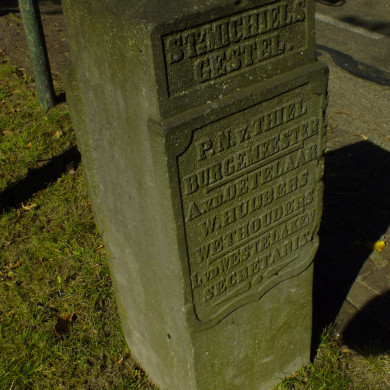 Vierkante hardstenen paal, breedte 32 cm., hoogte 90 cm. De paal is op circa 40 cm. hoogte aan drie zijden voorzien van in reliëf aangebrachte opschriften binnen een sierkader en heeft daarboven een insnoering met tweezijdig opschriften en een piramidebekroning met flauwe helling. Opschriften:
