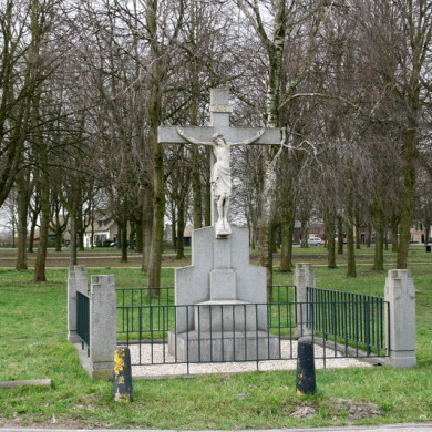 Het natuurstenen beeld toont een lijdende Christus, met doornenkroon en zijdewond en gekleed in een perizonium, een korte, los omgeslagen lendedoek. De handen zijn aan het kruis genageld, de voeten aan het suppedaneum. Kruistitel vermeldt 'INRI'. Het Christusbeeld hangt aan een sober geometrisch kunststenen kruis met een trapsgewijs opklimmende, blokvormige onderbouw met afgeschuinde bovenkanten en aan de zijkanten en achterkant drie schoren met afgeschuinde bovenkanten. De omliggende witte kiezelvloer wordt omzoomd door een op een kunststenen basement geplaatst sober ijzeren spijlenhek tussen kleine kunststenen pijlers met decoratief gehouwen koppen, voorzien van naar vier zijden gerichte Griekse kruisen.