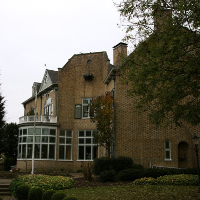 In het midden van de assymetrische (oostelijke) voorgevel op de begane grond ter plaatse van de grote hal een halfronde erker. Hierin ramen met dubbele bovenlichten, waarin glas-in-lood. Hierboven, ter hoogte van de grote slaapkamer een balkon met beglaasde balkondeuren, halfrond bovenlicht en zijlichten. Hierboven wordt de gevel afgesloten door een fronton met roosvenster.