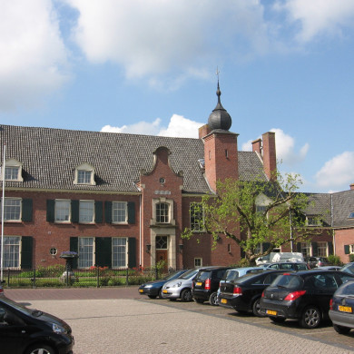 Rondboogvensters met glas-in-lood, op de begane grond met luiken. De vertrekken rechts in de oostelijke gevel zijn rechtgesloten en voorzien van houten luiken, op de begane grond twaalfruits, op de eerste verdieping negenruits. Ter hoogte van de zolder een drietal gekoppelde vensters negenruits ramen. Geheel links in deze gevel een steunbeerachtig element.
