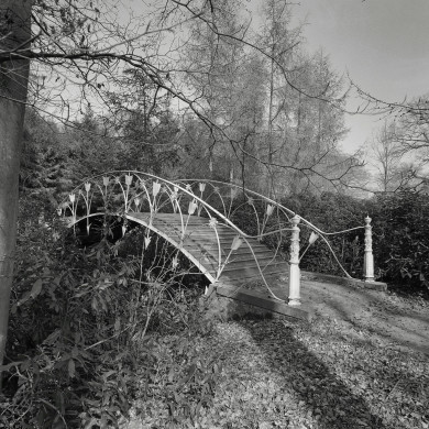 BRUG behorende tot de buitenplaats Mattemburgh. In het park ligt een gebogen ijzeren brug uit 1860 met gegoten ornamenten, kolommen en koppelijzers. Geleverd door C. Geers te Bergen op Zoom.