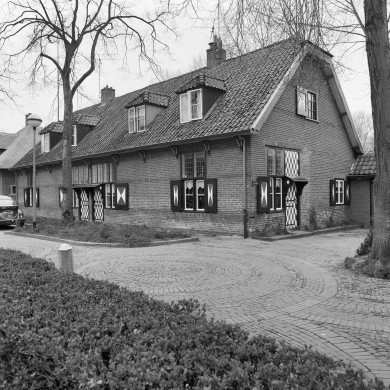 Blok van vier op een rij gelegen ARBEIDERSWONINGEN, uit 1896 in opdracht van E. Baron van Zuylen van Nijevelt gebouwd in vaderlands rustieke stijl, ontworpen door J. van Gils.