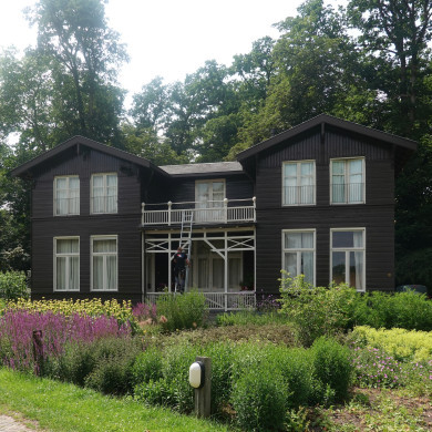HOUTEN HUIS (Xxa) gebouwd als onderdeel van de historische buitenplaats "Het Schol" aan de oprijlaan ten noordoosten van het huis. Het houten huis is opgetrokken in zwartgeteerde horizontale delen in chaletstijl van twee bouwlagen op H-plattegrond: twee rechthoekige bouwmassa's met overstekende flauwhellende zadeldaken, verbonden door een terugspringend lager middenstuk onder zadeldak; T-vensters en vierruits-ramen; in middenstuk gekoppelde glazen tuindeuren en -ramen.