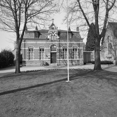 In de rechter zijgevel is er voor de verbinding met de kerk een half vierruits schuifraam zichtbaar. De gootlijst wordt op twee plaatsen onderbroken voor een dakkapel uit ca. 1950.