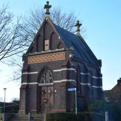 Vrijstaande Mariakapel op een rechthoekige plattegrond. De kapel telt één bouwlaag en wordt afgedekt met een zadeldak met leien. Het toegepaste bouwmateriaal is baksteen, deels geglazuurde baksteen, en hardsteen. Spitsboogvormige glas-in-lood vensters. Symmetrische indeling VOORGEVEL. Plint geaccentueerd met band geglazuurde baksteen. Rechthoekige dubbele houten deur met smeedijzeren beslag. Deur met spitsboogvormig bovenlicht met glas-in-lood met tracering in natuursteen, Aan weerszijden van de deur een steunbeer afgedekt met geglazuurde baksteen. Gevels met wit gepleisterde speklagen. Voorgevel uitlopend in een topgevel met hierin een horizontale band decoratief metselwerk. In de topgevel van de voorgevel vijf blinde spitsboogvormige venstertjes. In het middelste venster een houten luikje. Blinde vensters met doorlopende hardstenen dorpelsteen. Topgevel met hardstenen afdeklaag en bekroond met hardstenen pinakel. LINKER- EN RECHTERZIJGEVEL met elk twee spitsboogvormige glas-in-lood vensters en drie steunberen met afdekking van geglazuurde baksteen. Decoratief metselwerk onder de dakrand. Aan de ACHTERZIJDE van de kapel een driezijdige absis met schilddak met leien. In elke zijde van de absis een spitsboogvormig venster. Het middelste venster is blind, beide andere vensters met glas-in-lood. De drie gevelvlakken gescheiden door een steunbeer met afdekking in geglazuurde baksteen. Decoratief metselwerk onder de dakrand. Topgevel achterzijde van de kapel met eveneens hardstenen afdeklaag en bekroond met een hardstenen pinakel. Van het INTERIEUR is onder meer het volgende van belang. Plafond met spitsboog gewelven. Spitsbogen rusten op gestucte consoles. Vensters in een omlijsting van rode baksteen. Bakstenen altaar mdet hierop een houten Maria-beeld afkomstig uit het atelier Cuypers-Stoltzenberg te Roermond. Het Mariabeeld dateert uit 1898. Authentieke houten kerkbanken. Aan de voorzijde van de kapel een klein bordes met vier bakstenen treden en een hellingbaan van omstreeks 1990.