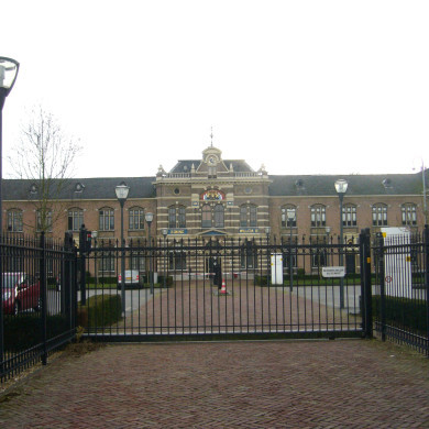 Hoekpaviljoens en het middenrisaliet, ieder onder een afgeplat schilddak, hebben een kroonlijst met gesneden consoles ter ondersteuning van de houten bakgoot, voorzien van een geprofileerde gootlijst. Het vooruit geschoven middendeel heeft bovendien een balustrade. Aan de voorzijde van het dak zijn kleine dakkapellen in de vorm van lucarnes aangebracht. Aan de achterzijde bevinden zich rechthoekige dakkapellen onder een plat dak voorzien van roeden draaivensters (1942). De symmetrisch ingedeelde voorgevel (westzijde) is vijftien vensterassen breed. De vensters in de voorgevel zijn binnen spaarvelden onder een ontlastingsboog met wit bepleisterde aanzetstenen geplaatst. Onder de vensters bevindt zich een rechthoekig vlak, deels voorzien van siermetselwerk in gele baksteen. Aan de onderzijde van de spaarvelden en onder de vensters zijn natuurstenen lekdorpels aangebracht. Met uitzondering van de hoekpaviljoens en het middenrisaliet zijn rondom op de begane grond tweelichts roeden vensters met bovenlichten geplaatst en op de verdieping driedelige vensters met bovenlichten. Het middenrisaliet is drie vensterassen breed en heeft een verhoogd risalerend deel geflankeerd door gekoppelde pilasters, dat eindigt in een halsgevel bekroond door een segmentboogvormig fronton met smeedijzeren windvaan. Op de begane grond bevindt zich een dubbele deur met rondboog bovenlicht onder een driehoekig fronton, op de verdieping twee rondboogvensters onder een ontlastingsboog, waarin het rijkswapen met aan weerszijden een leeuw met vlag en op de zolderverdieping binnen een halsgevel een dubbel venster met traliewerk onder een ronde wijzerplaat. Aan weerszijden is op de begane grond een driedelig rondboogvenster aangebracht en op de verdieping twee door een smalle muurdam van elkaar gescheiden vensters met een segmentboogvormig bovenlicht. Binnen de mezzanino is aan iedere zijde een rond venster geplaatst. Onder de vensters op de verdieping is links het opschrift "KONING" en rechts "WILLEM III" aangebracht en boven de pilasters aan weerszijden een cartouche met rolwerk met het opschrift "ANNO" en "1880", in vergulde letters en cijfers op een blauw veld.