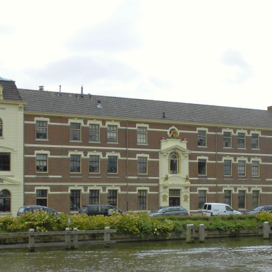 De voorgevel (westzijde) is in totaal vijftien vensterassen breed met een symmetrisch ingedeelde middenpartij van elf vensterassen breedte, geflankeerd door een twee venstersterassen brede partij van de hoekpaviljoens. De centrale ingangspartij wordt geaccentueerd door een rijk versierde bepleisterde omlijsting bestaande uit pilasters met een frontonbekroning. Binnen de omlijsting bevindt zich op de begane grond een dubbele paneeldeur met roedenverdeeld bovenlicht en op de verdieping een zesruits venster met rondboog bovenlicht voorzien van smalle omlopende boven- en zijlichten. Aan weerszijden van de ingang zijn twee metalen wapenschilden aangebracht. Boven de deuren bevindt zich een cartouche, geflankeerd door schilddragende leeuwen op een console met de tekst "PUPILLENSCHOOL onder beschermheerschap van z.m. den Koning opgericht 27 januari 1877". Op de tweede verdieping is boven het fronton van de omlijsting een opzetstuk aangebracht met op de uiteinden gevederde helmen en in het midden het rijkswapen. Het wapenschild is voor een rondboogvormige vensteropening geplaatst van de later toegevoegde verdieping.