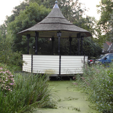 De op de hoek van de Lindengracht en de Raadhuislaan gelegen muziektent is deels op een vlonder in een brede sloot gesitueerd. De houten muziektent heeft een achtzijdig grondplan met aan zeven zijden een gesloten borstwering bestaande uit (witgeschilderde) gepotdekselde planken tussen (groengeschilderde) hoekribben. Acht geprofileerde, binnen de borstwering vrijstaande houten staanders (in de vorm van een dubbele stemvork) dragen een inzwenkend rietgedekt tentdak, bekroond door een staande trompet. Aan de binnenzijde is het dak voorzien van een plafond samengesteld uit acht segmenten van rabatdelen, die samenkomen in een rozet. De vloer van de muziektent bestaat uit houten vloerdelen.