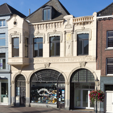 De DUBBELE WINKEL met BOVENWONING is gelegen in de gesloten straatwand van de Neerstraat in Roermond. Het pand is gebouwd in XIXd, de voorgevel is vernieuwd in 1911 in Eclecticisme met Jugendstil elementen in opdracht van loodgietersbedrijf Frans Janssens Höppener, naar ontwerp van architect F. Dupont uit Roermond. Het pand heeft nu diverse tinten blauw, maar was oorspronkelijk uitgevoerd in een zachte zandkleur. Het reliëf in de voorgevel is van beeldhouwer Mathieu Reynders, gemaakt in werkplaats van Cuypers en Stolzenberg. Tegen de achterzijde van het pand staat een achterhuis met versprongen verdiepingen. De begane grond is momenteel in gebruik als dierenwinkel en antiekhandel.