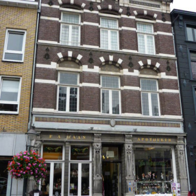 WOONHUIS en APOTHEEK. Symmetrische indeling voorgevel. Het pand telt drie bouwlagen en wordt afgedekt met een schilddak met Tuiles du Nord pannen.