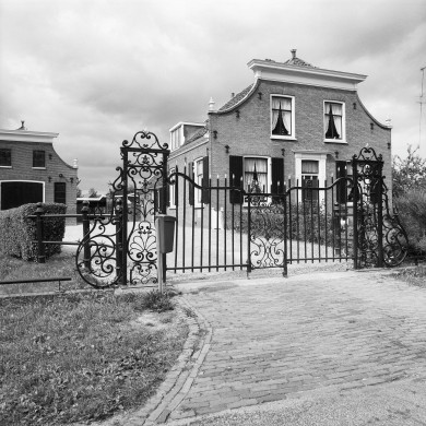 Bijna evenwijdig aan de achtergevel van de boerderij grenst tussen de boerderij en schuur een bakstenen muurtje met pyramidaal afgesloten hekpijlers waartussen een dubbel, gietijzeren draaihekis afgehangen.