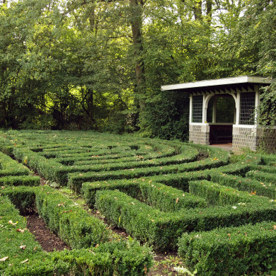 PARKAANLEG en LABYRINTH, als onderdeel van de buitenplaats Nijenrode. De buitenplaats heeft zijn oorsprong in een 13de eeuws kasteel. Belangrijke uitbreidingen en restauraties hebben zich onder meer in de 17de eeuw voorgedaan onder Johan I Ortt, die ook de opdracht gaf voor de aanleg van een formele tuin. Vanaf 1907 was de buitenplaats in het bezit van de Amsterdamse koffiehandelaar Michiel Onnes. Hij liet het kasteel onder leiding van architect E.G. Wentinck herstellen naar een 17de eeuwse situatie en voegde enkele bijgebouwen toe. De tuinarchitecten L.A. Springer en H. Copijn waren verantwoordelijk voor de tussen 1912-1915 tot Landschappelijke tuin omgevormde aanleg met een gemengd karakter. De Amsterdamse kunsthandelaar J. Goudstikker liet in 1930 het labyrinth aanleggen. Thans zetelt Nijenrode Universiteit voor Bedrijfskunde in het kasteel en is met de aankoop van grond in de richting van het Amsterdam Rijnkanaal het grondgebied van de buitenplaats opnieuw vergroot.
