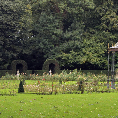 De rozentuin ligt ten noorden van het kasteel en is noord-zuid georiënteerd. Het is een geometrische, als formele tuin aangelegde tuin met gazons, grindpaden en rozenperken. Aan de west- noord- en oostzijde is de tuin omzoomd door hoge taxushagen met koepelnissen waarin beelden geplaatst zijn. Aan de zuidzijde bevinden zich beuken. Aan de westzijde bevindt zich een langgerekte pergola van hout voor klimrozen. Aan de oostzijde staat een ijzeren prieel. In het midden is een verdiept deel, dat ontsloten wordt door vier gemetselde trappen met natuurstenen dekplaten. Centraal gesitueerd bevindt zich een metalen prieel. Op de gazons staan vazen op sokkels. Aan de noordzijde bevindt zich een smal pad, omsloten met hagen, dat beëindigd wordt door een steile gemetselde trap met natuurstenen dekplaten en balustrade.