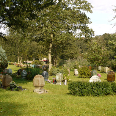 URNENVELD uit 1932, deel uitmakend van het crematoriumcomplex Velsen. Dit door de tuinarchitecte Neurdenberg in landschappelijke stijl ontworpen urnenveld is gesitueerd op en aan de voet van de duinhelling rond het noordoostelijke helft van het tweede columbarium. De paddestoelvormige urnen in dit urnenveld zijn ontworpen door Dudok.