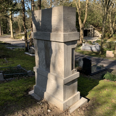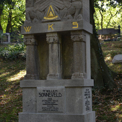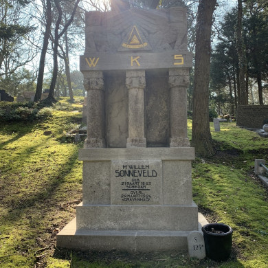 Uit 1926 daterend GRAFMONUMENT van W. Sonneveld (1863-1926), grootmeester van de Orde der Vrijmetselaren onder het Grootoosten der Nederlanden en vice-president van de Raad van Indië. Het grafmonument werd ontworpen door Simon Franco (1872-1931), eveneens lid van de vrijmetselaarsorde.