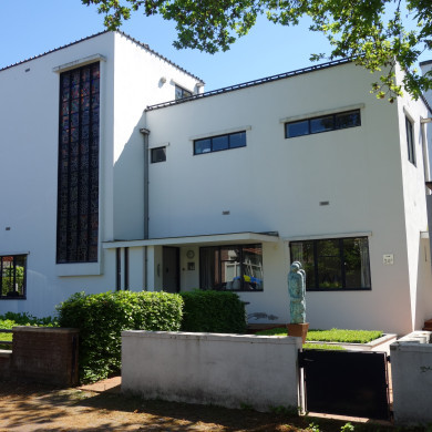 De achtergevel (Z) wordt bepaald door uitspringende tweede bouwlaag met balkon met bepleisterde borstwering. Het terras op de begane grond is met rode tegels bedekt en loopt om de hoek naar de oostgevel. Op de hoek geeft een halfrond gemetselde trap van drie treden toegang tot de tuin. Op de begane grond links een stalen glasdeur met zijlicht in samengesteld kozijn en rechts twee grote vierledige kozijnen met vensters en deuren naar het terras. Het rechter kozijn ligt terug onder het op de hoek halfrond eindigende balkon van de eerste verdieping dat over de hele breedte van de gevel loopt. Hier komen drie vierdelige kozijnen met deuren naar het balkon voor en een venster met openslaande ramen. Op de linkerhoek de schoorsteen en in de rechter zijgevel een venster. Het platte dak boven dit bouwvolume vormt het balkon ("zonnebad") van de tweede bouwlaag. In het hoger opgaande terugliggende bouwvolume rechts een samengesteld kozijn met deur op de eerste verdieping en op de tweede verdieping rechts een drieledig venster en links een deur met zijlicht die opent naar het zonnebad. In de rechter zijgevel (O) beganegronds een groot drieledig kozijn met glasdeuren die openen naar het terras en links daarvan onder de halfronde overstek van het balkon een tweeruits venster. Op de verdieping een vierledig venster. Langs de gevel voert een buitentrap, waarvan de treden zijn belegd met rode tegels, naar het balkon op de eerste verdieping en vandaar gaat een tweede kleinere trap naar het balkon op de tweede verdieping. Op de borstweringen van de trappen stalen buisrelingen. In de zij- en achtergevels van de éénlaagse aanbouw (praktijkruimte) aan de achterzijde diverse vensters met stalen kozijn van verschillend formaat.