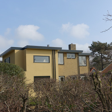 De voorgevel wordt gekenmerkt door trapsgewijs teruggerooide, drie geveldelen. Links bevindt zich een eenlaags aanbouw met driestrooks venster, gevolgd door het middendeel waarin in de oksel met het meest rechter geveldeel een uitgebouwd rookkanaal voorkomt en de entreepartij onder luifel. In de uitbouw links twee stolpramen boven elkaar en rechts op de begane grond een enkel venster en op de verdieping twee kleine vensters met uitzetramen. In het terugliggende geveldeel rechts twee vensters met stolpramen boven elkaar. In de rechter zijgevel (Z) rechts op de begane grond een driedelig samengesteld kozijn met deur naar het terras en op de verdieping een enkel venster. Aan de achtergevel (O) over de hele breedte een (vernieuwd) balkon waarop rechts een dubbele glasdeur opent en links een drieledig kozijn met balkondeur. Op de begane grond een drieledig kozijn met deur naar de tuin en rechts een venster met stolpraam. Voor het midden van de linkerzijgevel (N) een lage uitbouw (bijkeuken). Links daarvan in de gevel een stolpraam.