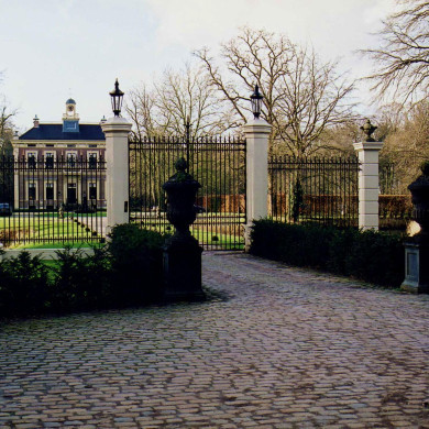Toegangshek (XIX), tussen de Alerdinckweg en het voorplein, bestaande uit vier gepleisterde pijlers met bosseringen die bij de voeten met elkaar zijn verbonden. Tussen de twee hogere middelste pijlers zijn twee draaibare vleugels aangebracht. Deze pijlers zijn voorzien van dekplaten waarop lantaarns staan. De twee lagere buitenste pijlers zijn eveneens voorzien van dekplaten waarop natuurstenen siervazen (XVIII) staan. Tussen de hoge en lage pijlers eveneens een ijzeren hekwerk. De vleugels zijn voorzien van een modern elektronisch systeem zodat de vleugels automatisch kunnen worden geopend.