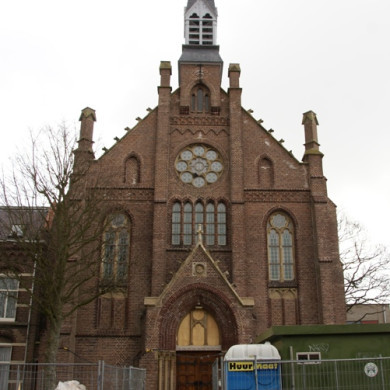 De symmetrische voorgevel (westzijde) wordt verdeeld door vier steunberen, die bekroond zijn door overhoeks geplaatste pinakels, waarvan het bovenstuk ontbreekt. De middelste twee steunberen flankeren de middenas die bekroond wordt door de dakruiter. De overige twee steunberen maken deel uit van de geveluiteinden. In de teruggelegen muurvlakken van de buitenste traveeën zijn spitsboogvormige geveluitsparingen aangebracht. Deze uitsparingen zijn onderin voorzien van twee gekoppelde spitsboogvormige spaarvelden. In het bovendeel staat een spitsboogvormig venster met tracering bestaande uit driepasmotief en gelobde cirkel. Boven de vensters is een baksteenfries geplaatst ter afscheiding van de afgeschuinde gevelvlakken erboven, waarin zich spitsboogvormige spaarvelden bevinden. De gevelvlakken hebben een afdekking met gebeeldhouwde hogels. In de wat rijker uitgevoerde middenpartij is de toegangspartij ondergebracht in een uitgebouwd spitsboogvormig portaal, bekroond door een wimberg met schouders en kruisbloem. In het portaal vormen drie gedrukte spitsbogen, die zijn geplaatst op zuilen met Corinthisch kapiteel, de overgang naar de zware geprofileerde paneeldeuren. Boven de deuren staat een spitsboogvenster met tracering. In het teruggelegen gevelvlak boven de toegangspartij zijn vijf langgerekte spitsboogvensters geplaatst, met daarboven een roosvenster met natuurstenen tracering. Het gevelvlak wordt beëindigd door een baksteenfries met daarboven de uitkragende bakstenen aanzet van de dakruiter. In deze aanzet is een spitsboog met drielichtsvenster aangebracht.