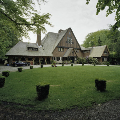 Landhuis met aan de zuidwestzijde aangebouwde dienstwoning, opgetrokken in twee bouwlagen en een hoge kapverdieping op een onregelmatige rechthoekige plattegrond. Aan de noordzijde een rechthoekige aanbouw (keuken, garage) van één bouwlaag onder kap en in de zuidwesthoek een rechthoekige aanbouw (dienstwoning) ter hoogte van een bouwlaag en een kapverdieping. De noklijn van de forse gedrapeerde rieten kap ligt boven het hoofdvolume en de noordelijke aanbouw evenwijdig aan de weg met steekkappen aan de west- en oostzijde. Boven de dienstwoning aan de zuidwestzijde ligt de noklijn haaks op de weg. Het geheel is opgetrokken in rode handvormsteen op een rustica plint met in de topgevels siermetselwerk gevat in vakwerk. De gevels zijn verder voorzien van natuurstenen onderdelen, zoals onder meer de zuilen van de garagegalerij. De vensters op de begane grond hebben luiken. De reeksen met kleine vensters hebben vier-ruitsramen. De voorgevel (W) bevat in het hoofdvolume in het midden de ingangspartij met deur en vensters tussen vakwerkstijlen in een risalerende aanbouw onder steekkap. Een klein venster is geplaatst in de topgevel boven een decoratief bewerkte latei. Op de begane grond aan weerszijden van de ingangspartij twee paar openslaande ramen, op de verdieping onder de risalerende latei op consoles van de topgevel drie gekoppelde vensters. De topgevel bevat in het midden een traplicht, bestaande uit negen vierkante vensters, de buitenste onderaan met luiken. In de nok een enkel venster. Aan de linkerzijde de gedeeltelijk dichtgezette voormalige garagegalerij, bestaande uit zes bogen op natuurstenen aanzetstenen en zuilen. Dakkapel met vier kleine vensters in het dakvlak. Op de overgang van het hoofdvolume en de aanbouw rijst de grote tapstoelopende schoorsteen met sierbanden en natuurstenen blokken omhoog. De noordgevel van het hoofdvolume bevat op de begane grond en de verdieping drie gekoppelde vensters, op de begane grond zonder roedenverdeling. In het dakvlak een dakkapel en ter hoogte van de kapverdieping een ateliervenster. De zuidgevel van het hoofdvolume bevat later vergrote gevelopeningen, op de verdieping uitkomend op een balkon met houten spijlenbalustrade. In dakvlak dakkapel van vier kleine vensters. De symmetrische achtergevel (O) bevat in het midden een sterk risalerende topgevel met overkragende tweede en derde laag boven latei op consoles. Op de begane grond een venster, bestaande uit een breed onderraam met zijramen onder vijf bovenlichten. Op de verdieping breed raam met zijramen, in de nok drie vierkante vensters. De risaliet is lager uitgevoerd dan die aan de westzijde. Op de nok een schoorsteen. Openslaande deuren in de zuidzijde van de risaliet, op de verdieping een venster. Links van de risaliet bevindt zich op de begane grond een venster, bestaand uit breed raam met zijramen "Het oorspronkelijke raam rechts van de risaliet is vervangen door twee openslaande deuren met zijramen". Op de verdieping een reeks van vijf vensters boven bloembak op consoles, in dakvlak dakkapel met vier kleine vensters. In terugliggende gevelvlak rechts vensters, evenals in de oostgevel van de voormalige garage.