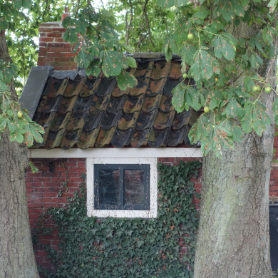 In de topgevel aan de noordzijde een opgeklampte houten deur. In zowel de oost- als westgevel een tweeruits venster.