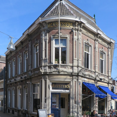 Het Eclecticistische WOON-WINKELPAND dateert uit 1885. Onderdelen van het bedrijfsgedeelte dateren uit 1822, voordat een grote brand in 1880 het geheel grotendeels in de as legde. Het pand herbergde tevens de kaarsenfabriek van M.C.N. Bressers. De oorspronkelijk vrijwel geheel blinde zijgevel aan het Stadhuisplein is rond 1990 voorzien van een reeks nieuwe zesruits vensters. Hierbij werd onder meer de drielaagse indeling van het bedrijfsgedeelte grotendeels teruggebracht tot twee bouwlagen.