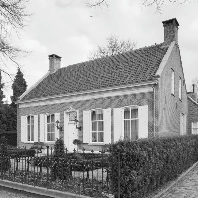 Eenlaags woonhuis, opgetrokken uit baksteen onder zadeldak met oud-Hollandse pannen met aan de achterzijde een aanbouw, de stal met voormalig koetshuis, onder afgewolfd zadeldak. De voorgevel telt vijf traveeën en heeft een gepleisterde plint. De voordeur is een kussenpaneeldeur met getoogd bovenlicht, gevat in een stucomlijsting met kuif. Links en rechts twee getoogde zesruits schuiframen, voorzien van paneelluiken, onder trapsgewijs gemetselde, sierlijke segmenttogen. Gestuct fries met verdiepte velden, tandlijst en houten gootlijst. De linker zijgevel heeft beneden een zesruits schuifraam met oorspronkelijk houten rolluik met kast en op de verdieping twee getoogde zesruits ramen. Topgevel met rollaag en schoorsteen. De rechter zijgevel heeft zesruits ramen met luiken en boven getoogde zesruits ramen, een topgevel met rollaag en hoekschoorsteen.