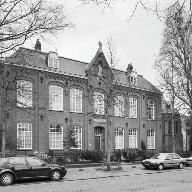 Tweelaags kloostergebouw, opgetrokken uit baksteen, onder met leien gedekt afgeplat schilddak, aan de rechterzijde voorzien van een haaks op de straat gerichte bakstenen kapel onder met leien gedekt zadeldak. De voorgevel heeft een hardstenen plint, waarboven een druiplijst van geglazuurde steen en telt zeven traveeën, waarvan de middelste en de hoekvakken door bakstenen lisenen worden aangeduid. Per travee boven en onder schuiframen met vierentwintigruits kleine roedenindeling. De lisenen eindigen ter hoogte van de geprofileerde lijstgoot in deels getande uitmetselingen en worden met elkaar verbonden door segmenttogen en een rijk gedetailleerde getande lijst. Gesmede sierankers. De middenrisaliet heeft een ondiep portiek met paneeldeur met driepassen en een vierdelig bovenlicht. Erboven een tegeltableau met de kloosternaam 'St. Petrus'. In de met geglazuurde baksteen afgedekte topgevel een spitsboognis met kunststenen beeld van de H. Jozef onder kruis. In het dakvlak links en rechts een dakkapel. De zijgevel heeft twee kleine roedenvensters met rolluiken en een tandlijst onder de goot. In het dakvlak een dakkapel. De achtergevel is symmetrisch ingedeeld en heeft op de verdieping zes openslaande vierentwintigruits ramen en in het midden een raam voor het trappenhuis. In het dakschild drie dakkapellen. De kapel heeft aan de straatzijde een driezijdig gesloten absis met overhoekse steunberen en een fries. In de eindgevel drie lancetramen. In de eenvoudige lange zijgevel rechts zes smalle lancetvensters. In de koorramen heiligenfiguren. Aan de linkerzijde een tweelaagse aanbouw onder met leien gedekt zadeldak. Twintigruits schuiframen. Aan de straatzijde een smeedijzeren hekwerk op bakstenen voetmuur, met poortjes tussen bakstenen pijlers.