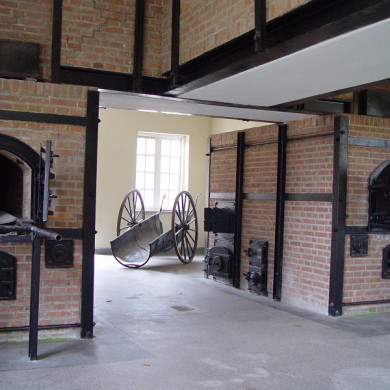 In het inwendige van het crematoriumgebouw is de oorspronkelijke dispositie grotendeels gehandhaafd. In de oostelijke vleugel aan de voorzijde een gang. Hierlangs zijn de vertrekken van de arts gelegen: links een zitkamer en behandelkamer, rechts hiervan achtereenvolgens een toilet, kantoorruimte, laboratorium en een snijkamer met sectietafel. In de noordelijke vleugel aan de voorzijde, rechts van de ingang, een reconstructie van gevangeniscel 115 uit de "Bunker" (complexonderdeel 10). Hierachter een ruimte, die bestemd was voor de opslag van lijken. In de meest westelijke helft van de noordelijke vleugel twee vaste crematieovens.