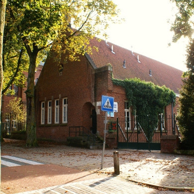 De hoofdingang is gelegen aan de westelijke zijde van het schoolgebouw en bestaat uit een dubbele openslaande eikenhouten deur met vensters. Deze is gelegen in een portaal met rondboog, voorzien van massieve natuurstenen geboorten. Een lage hardstenen trap leidt naar dit portaal. Boven de ingangspartij een kleine topgevel met een rondboogvenster. Deze topgevel is afgedekt met een natuurstenen lijst, bekroond met een kruis. Rechts van de ingangspartij zijn de klaslokalen voorzien van grote, per twee gekoppelde rechtgesloten vensters, voorzien van stalen ramen met hierin eenvoudig glas-in-lood. Boven deze vensters strekken, in het midden tussen de gekoppelde vensters voorzien van natuurstenen blokken. Geheel rechts in de voorgevel, ter hoogte van een smalle gang, is een kleiner venster met tweeruits raam aangebracht. Rechts hiervan een rechthoekige éénlaags aanbouw onder lessenaarsdak voor de fietsenstalling. De bakstenen muren van deze aanbouw worden aan de bovenzijde afgedekt door een natuurstenen lijst, met een blokvormig element op de zuidwestelijke hoek. Deze aanbouw is aan de westelijke zijde geopend door twee grote rondbogen, rustend op een betonnen/natuurstenen zuil met blokkapiteel, waarboven een natuurstenen booggeboorte. In het achterste gedeelte van de fietsenstalling is later een kantoorruimte aangebracht, waarbij de boogvormige opening met een wand werd afgesloten. Aan de zuidzijde van de fietsenstalling is een kleinere boog aangebracht. De oostelijke gevel van het schoolgebouw en de aansluitende fietsenstalling is geheel gesloten. De topgevel boven de kopgevel van de school is aan de bovenzijde voorzien van een natuurstenen deklijst.