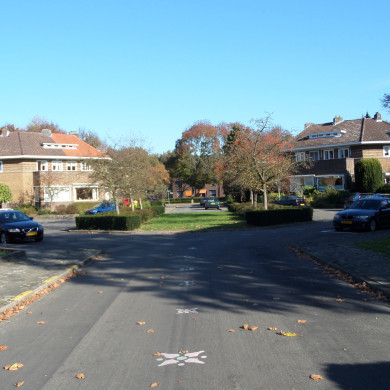 Een op het centrale plein van het complex Julianaplein e.o. gebouwd blok met twee herenhuizen onder één kap van het gecombineerde type CC.
