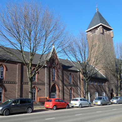 Voormalige KLOOSTERKERK met SACRISTIE en VERBINDINGSVLEUGEL in een door de Neo-Gotiek en het Expressionisme beïnvloede bouwstijl, 1928. Ontworpen door architect Joseph Wielders te Sittard in opdracht van de Missionarissen van het H.Hart, gebouwd door aannemer B. Muyres te Sittard. Marmer- en steenhouwwerken gerealiseerd door Victor Laudy te Sittard. Deze kerk is als zodanig de vijfde uitbreiding van het klooster van de Missionarissen van het H.Hart in Leijenbroek. De kloosterkerk is gesitueerd parallel aan de Leijenbroekerweg, dwars tegen de oostgevel van de Duitse school uit 1900 en via een verbindingsvleugel verbonden met de kloostervleugel uit 1910. Door de bouw van deze voormalige kloosterkerk is er, naast de binnenplaats van het oudste kloosterdeel uit 1889, een tweede gesloten binnenplaats ontstaan. De sacristie is gesitueerd aan de noordwestzijde van de kerk. De in 1963 in aansluiting op de sacristie gerealiseerde pastorie en de scheidingsmuur op de binnenplaats zijn UITGESLOTEN van bescherming.