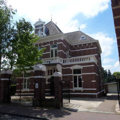 Vrijstaande villa met gedeeltelijke souterrainverdieping, twee BOUWLAGEN en zolderverdieping op L-vormige PLATTEGROND. In de oksel, aan de noordzijde, een uitbouw van één laag onder plat. Het L-vormige bouwvolume wordt gedekt door SCHILDDAKEN met kruispannen. Bakgoten, aan de straatzijde, rustend op een gewelfde kooflijst en houten consoles. Deze consoles rusten op leeuwenkopornamenten. Op de nok restanten van nokornamenten, zinken en smeedijzeren nokpionnen. Twee hoge schoorstenen en een eenvoudige dakkapel op het westelijke zijdakvlak, een hoge schoorsteen op het oostelijke dakvlak, een driehoekige dakkapel met halfrond venster op het terugliggende dakvlak aan de noordzijde, een aanzienlijke dakkapel met hardstenen vensterlatei, gestuct rondboogfronton en bolornament, klauwstukken op het noordelijke dakdeel aan de voorzijde. De villa heeft een rode bakstenen optrek in kruisverband, met gesneden voegen. Geprofileerde plint met gesausde hardstenen lijst. Gesausde hardstenen speklagen. Gestucte diamantkoppen, gestucte vensterlijsten met frontons en bloemmotieven, gestucte aanzet en sluitstenen.