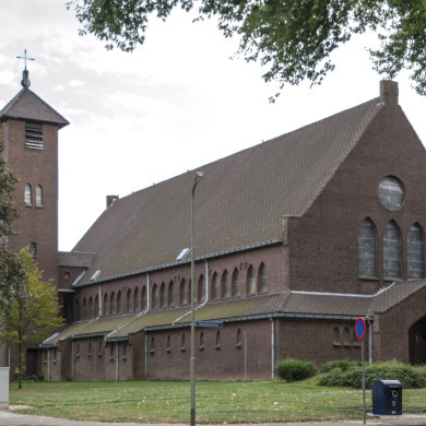 De uitgebouwde BERGPLAATS aan de zuidzijde is in de zuidelijke gevelzijde blind, in het korte vrijgebleven westelijke zijgeveldeel bevindt zich een spitsboogvormig stalen venster met glas-in-lood. In de oostgevel van de bergplaats een rechthoekige houten buitendeur. De bergplaats heeft uitkragende gevelhoeken met een afdekking van grespannen. De KLOKKENTOREN aan de noordzijde is met het hoofdvolume verbonden middels een loopbrug met rechthoekige stalen vensters en een lessenaarsdak, die boven de lichtbeuk op de dakconstructie van het schip is ingestoken. De toren heeft in de westelijke gevelzijde een rechthoekige houten toegangsdeur, ter hoogte van de trapbordessen een rechthoekig stalen venstertje en daarboven in elke gevelzijde twee spitsboogvormige stalen venster plus een rechthoekig galmgat met galmborden. Het achter het schip gelegen KOORVOLUME versmalt ten opzichte van het schip en heeft in beide gevelzijden twee spitsboogvormige stalen vensters met glas-in-lood. Koor en schip worden beëindigd door tuitgevel met uitkragende schouderstukken en een bovenafdekking met grèspannen. De achter het schip en koor geplaatste ABSIS versmalt wederom ten opzichte van het koor en heeft twee spitsboogvormige vensters met glas-in-lood in beide zijden van de lichtbeuk. De absis wordt aan de oostzijde beëindigd door een blinde tuitgevel met uitkragende schouderstukken en een bovenafdekking met grèspannen. De absis wordt aan de oost-, zuid- en noordzijde omgeven door zijbeuken c.q uitbouwen onder lessenaarsdak. Aan de zuidelijke gevelzijde heeft deze uitbouw tweemaal tweegewijs gekoppelde stalen spitsboogvensters met glas-in-lood en twee souterrainvensters; aan de noordelijke gevelzijde tweemaal driegewijs gekoppelde stalen spitsboogvensters met glas-in-lood. Twee verticaal ingedeelde stalen souterrainvensters. In de oostelijke gevelzijde een reeks van zeven spitsboogvormige stalen glas-in-loodvensters, waaronder een tweetal verticaal ingedeelde souterrainvensters. Aan weerszijden een rechthoekige houten buitendeur. De deur aan de noordzijde wordt voorafgegaan door een trapbordes, geplaatst achter een schutmuur.