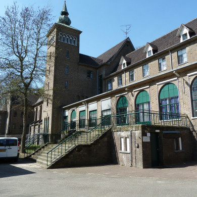 De zuidgevel loopt uit in een klokgevel met schouderstukken. In de souterrainverdieping drie driegewijs gekoppelde rechthoekige stalen vensters; in de eerste laag twee reeksen van driegewijs gekoppelde stalen rondboogvensters met kleine roedeverdeling, ter hoogte van de voormalige refter cq. recreatieruimte van de paters; in de tweede en derde laag vijf rechthoekige stalen vensters met kleine roedeverdeling van de voormalige verblijfskamers van de paters. Ter hoogte van de zolderverdieping twee tweegewijs gekoppelde stalen rondboogvensters in natuurstenen lijsten; hoog in de klokgevel een blind oeil de boeuf-venster met omlijsting.