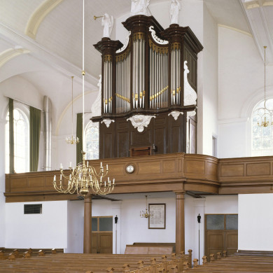 Het transept is drie traveeën breed en slechts één travee diep. De vensters in de zijgevels van het dwarsschip zijn blind, maar wat betreft vorm en afwerking identiek aan die in de voorgevel van het schip. De topgevels van het transept worden geopend door drie rondboogvensters. De twee buitenste vensters zijn identiek aan die in de voorgevel van het schip. Het middelste venster is echter beduidend breder en hoger en heeft in de top een roosvenster. Hoog in de punt van de gevel is een ronde ventilatie-opening aangebracht. Overigens hebben ook deze gevels een getrapt fries. De achtergevel van het schip risaleert licht, waardoor de overgang van schip en transept duidelijk wordt aangegeven. De vensters in de zijgevels van het transept zijn blind, de achtergevel van het schip wordt door drie vensters geopend. Ook hier geldt weer dat de flankerende vensters identiek zijn aan die in de voorgevel. Het middelste venster is wat betreft vorm identiek aan die in de voorgevels van het transept, maar het onderste deel ervan is blind. De voormalige consistorie stond centraal tegen de achtergevel en was vanuit de kerk toegankelijk. Rond 1996 is een en ander ingrijpend verbouwd ten behoeve van het ontmoetingscentrum Vijverhof. Het interieur maakt een ruime en heldere impressie, geheel eigen aan de protestantse traditie, wat wordt bewerkstelligd door de toepassing van grote vensters met helder glas en wit gekleurde, niet of nauwelijks gedecoreerde muurvlakken. De vloer van de kerk is van hout. De kerkzaal beslaat, afgezien van het tochtportaal en de consistorie, het gehele gebouw. Er is een eenvoudig en vrijwel niet gedecoreerd portaal dat de gehele breedte van de voorgevel in beslag neemt. Het middelste deel van het portaal bestaat uit steen, aan weerszijden daarvan bevindt zich het houten deel dat ten opzichte van het midden naar voren springt. Boven dit portaal is een houten orgeltribune aangebracht die de gehele voorgevel in beslag neemt en op deze wijze de afsluiting vormt van het tochtportaal. De tribune heeft in het midden een uitstulping met afgeronde hoeken die op twee Toscaanse zuilen rust. Centraal op deze tribune staat een imposant orgel van de Utrechtse maker J.F. Witte (met een vijfdelige orgelkast verdeeld in drie halfronde pijpentorens en twee gebogen velden). Klauwstukken, consoles en lambrequins zijn uitbundig bewerkt en helder wit van kleur. Het orgel is niet van waarde uit het oogpunt van monumentenzorg. De orgelkas, gemaakt door C.G.F. Witte in 1872, is wel van waarde uit het oogpunt van monumentenzorg.