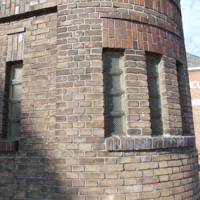 In de oostgevel een dubbele stalen deur; twee staande lichtsleuven gevuld met glazen bouwstenen onder een rollaag. In de gebogen hoekpartij drie door muurdammen van elkaar gescheiden staande lichtsleuven met glazen bouwstenen, samengevat onder één rollaag. In de noordgevel twee keer drie door muurdammen van elkaar gescheiden (later dichtgemetselde) lichtsleuven, samengevat onder één rollaag; een dubbele stalen deur. In de westgevel een stalen deur; twee keer twee door een muurdam gescheiden (later dichtgemetselde) lichtsleuven, samengevat onder één rollaag. Alle lichtsleuven hebben een anderhalfsteens rollaag afgezet met een smalle horizontaal gemetselde rand en gemetselde onderdorpels. Alle deuren hebben een anderhalfsteens rollaag afgezet met een smalle horizontaal gemetselde rand, en aan weerszijden een halfronde, verticaal gemetselde pilaster.