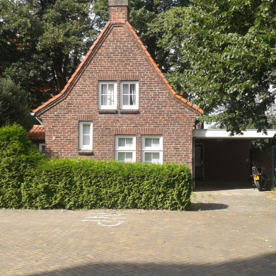 In het verlengde van de onderdoorgang, schuin achter het raadhuis, ligt een kleine DIENSTWONING.
