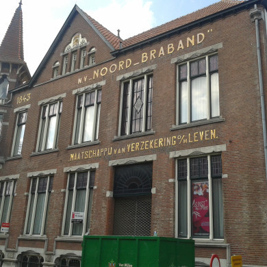 Tweelaags blokvormig bakstenen pand op een rechthoekige plattegrond, onder een samengesteld dak. De hoofdmassa heeft een plat dak met dakschilden, gedekt met verbeterde Hollandse pannen en pirons. De linkerhoek aan de straatkant heeft een uitkragend torentje met spits. In de achtergevel is de hoek uitgespaard. Hier bevindt zich de huidige ingang aan een trap in een portaal onder lessenaarsdak. Links van het midden heeft de voorgevel een topgevel met zadeldak. De voorgevel is vijf traveeën breed en voorzien van een rijk gedecoreerde natuurstenen plint met geprofileerde lijsten en gebosseerde vlakken. Op de hoek is de handtekening van de architect uitgebeiteld: "W.F.J.H.Bouman, Architect Tilburg". In de plint grote kelderramen in houten kozijnen met afgeronde hoeken. Deze sierlijke vormgeving wordt herhaald in de natuursteen van de plint. Boven de plint een waterlijst, opklimmend ter plekke van de ramen. Deze ramen zijn hoog en samengesteld: driedelig met bovenlichten gevuld met glas-in-lood. Erboven zijn natuurstenen lateien aangebracht, in de natuursteen zijn accoladebogen uitgehakt. Rechts van het midden is op de begane grond een portiek met natuurstenen trap aangebracht. Daarachter een later gemaakte draaideur. Gelijk lopend met de gevel is boven in de portiekopening een glas-in-loodraam met waaiervormige roeden gemaakt. Op de verdieping boven de portiek een glas-in-loodraam, bij de overige ramen is alleen het bovenlicht gevuld met glas-in-lood. Onder de geprofileerde goot op klossen is in goudkleurige (metalen) letters het opschrift: "1843" en "N.V. NOORD-BRABAND" aangebracht. Boven de ramen van de begane grond is het vervolg "MAATSCHAPPIJ VAN VERZEKERING O/H LEVEN" leesbaar. De topgevel, voorzien van windveren, heeft smalle staande raampjes. De middelste drie, van in totaal vijf zijn hoger en onder een drielobbige boog gezet. In het boogveld een polychroom reliëf waarop het wapen van Brabant en bloemen zijn afgebeeld.