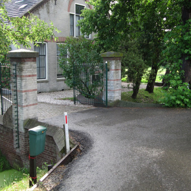 Het toegangshek bestaat uit in witte kalkzandsteen opgemetselde hekpijlers met rode banden, en lage voetingen van grauwe baksteen langs de slootkant, voorzien van ezelsruggen. Het ijzeren dubbele draaihek dat aan de pijlers is opgehangen, heeft eenvoudige spijlen met bescheiden speerpunten.