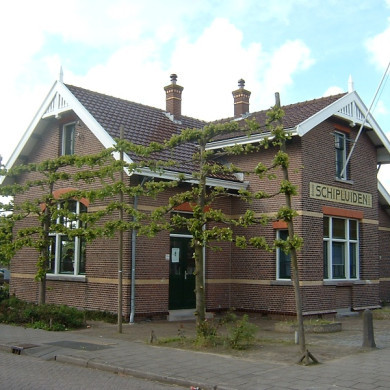 In de zuidelijke voorgevel met middenrisaliet, links dubbele glasdeuren met bovenlicht naar de wachtkamer, in de risaliet een samengesteld kozijn met centraal een raam op de plek van de tegenwoordig dichtgemetselde deur. De drempel is nog aanwezig. Boven het kozijn een tegeltableau met de naam 'Schipluiden'. In de zijkanten van de risaliet een drieruits staand venster. Ter rechter zijde van de risaliet dubbele deuren onder een vierruits bovenlicht.