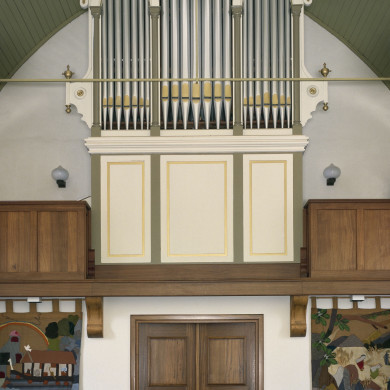 Structuur van het INTERIEUR is vrijwel in tact. De volgende interieuronderdelen zijn onder meer van belang. Portaalruimte met vloer met authentieke plavuizen. Kerkruimte met authentiek houten tongewelf.