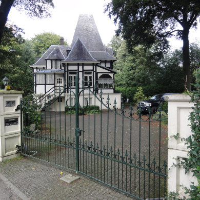 Het WOONHUIS is opgebouwd in vakwerk, op een gepleisterde, bakstenen onderbouw. Het pand heeft een rechthoekig grondplan, met een asymmetrisch ingedeelde plattegrond en een asymmetrische indeling van de gevels. Het geheel is twee bouwlagen en een zolderverdieping hoog en wordt gedekt door een samengestelde kap met ongelijke nokhoogten. Het dak bestaat uit hoog opgaande geknikte schilddaken over de verschillende ten opzichte van elkaar verspringende bouwvolumes, waarbij één dak hoog boven de andere uitsteekt. Daarnaast zijn ook lessenaarsdaken toegepast. De schilden zijn belegd met leien in rechtse Rijndekking en met leien in Maasdekking. In de schilden bevinden zich enkele dakkapellen. De afwatering vindt plaats via geprofileerde en overstekende bakgoten op geornamenteerde consoles. Uit het dak steekt een hoge in rode baksteen gemetselde schoorsteen. De gevels van het pand bestaan uit houten stijl- en regelwerk met een witgeschilderde baksteenvulling. De onderbouw wordt afgesloten met een omlopende, gekorniste kroonlijst. Het hout van de gevels is thans groen geschilderd en bezit een profilering. Binnen de gevels zijn verschillende typen vensters toegepast in houten kozijnen, sommige gevuld met glas-in-lood. De gevels worden rondom afgesloten door een verhoogde dakrand met balusters. Als bijzonderheid is nog de vermoedelijk oorspronkelijke waterspuwer te noemen die zich in de vorm van een drakenkop op een gevelhoek in de linker zijgevel bevindt. De VOORGEVEL (gericht naar de hoek Oude Holleweg, Stollenbergweg) is in te delen in drie ongelijke traveeën die van rechts naar links trapsgewijs terugspringen en verschillend in hoogte en afdekking zijn. Rechts bevindt zich in het basement een dubbele garagedeur onder gedrukte korfboog. Hierboven bevindt zich een dichte loggia met rondboogvensters. De middentravee heeft in de onderbouw twee licht getoogde gevelopeningen met stolpramen. In de tweede bouwlaag bevinden zich twee stolpramen onder enkelruits bovenlichten. De ver terugspringende linker travee heeft rechts in de onderbouw de hoofdingang, met links ervan twee vierruits vensters. Voor de huidige ingang bevindt zich een gemetseld muurtje. De tweede bouwlaag heeft onder de dakrand een vensterzone bestaande uit zesruits vensters gescheiden door de stijlen van het vakwerk. Het dak van dit bouwdeel heeft een terugliggend dakhuis bekleed met leien en voorzien van gekoppelde zesruits vensters. De RECHTER ZIJGEVEL oogt symmetrisch en bestaat uit een sterk verticaal gericht middendeel dat iets naar voren springt en aan weerszijden lagere, met lessenaarsdaken gedekte horizontale partijen, waar zich respectievelijk de dichtgezette loggia (links) bevindt en een open loggia (rechts), beide opgebouwd uit balusterachtige stijlen en rondbogen. De bovenlichten van de loggia links zijn gevuld met eenvoudig gekleurd glas-in-lood. In het basement van het middengedeelte is in de jaren vijftig een grote glaspui aangebracht met dubbele deuren, de linker en rechter travee bezit hier elk drie kleine vensters hoog in de bouwlaag. De torenachtige middentravee heeft in de tweede bouwlaag een groot samengesteld kozijn dat aan de bovenzijde korfboogvormig is afgesloten. Het venster is volledig gevuld met glas-in-lood met gebrandschilderde ruiten. Het glas is volgens opschrift vervaardigd in 1874 door het atelier 'J.H. Roth Glasmalerei' in Neurenberg. Het bestaat onder meer uit wapenschilden en op de Renaissance geïnspireerde siermotieven zoals grotesken. Boven het vensters begint direct de iets uitkragende attiekzone met dubbele balusters op de gevelhoeken. Centraal in deze attiek bevindt zich een dakkapel onder schilddak, met een halfrond afgesloten venster en een uitgesneden tongewelf aan de onderzijde. De asymmetrische ACHTERGEVEL heeft een verticaal gerichte middenpartij markant afgesloten met een afgewolfd zadeldak, met geknikte en uitkragende schilden. In het basement van deze partij bevindt zich een vensterzone van vier gekoppelde vierruits vensters. In de tweede bouwlaag bevinden zich twee stolpvensters met enkelruits bovenlichten en in het rondboogvormige spaarveld van de afgeplatte puntgevel een stolpraam. Links sluit de zijgevel van de loggia aan met een deur in het basement. De rechter travee springt sterk terug en heeft in het basement twee deuren en een venster. De tweede bouwlaag heeft een klein schuifvenster. De LINKER ZIJGEVEL heeft een hoger opgetrokken middenpartij en iets terugwijkende lagere zijpartijen. De middentravee heeft centraal gekoppelde stolpvensters in het basement. In de tweede bouwlaag bevinden zich gekoppelde stolpramen onder bovenlichten. In het voorschild bevindt zich een dakkapel. Het gevelvlak van de linker partij heeft geen openingen. De rechter travee heeft een vensterzone met aan elkaar gekoppelde vensters direct onder de dakrand.